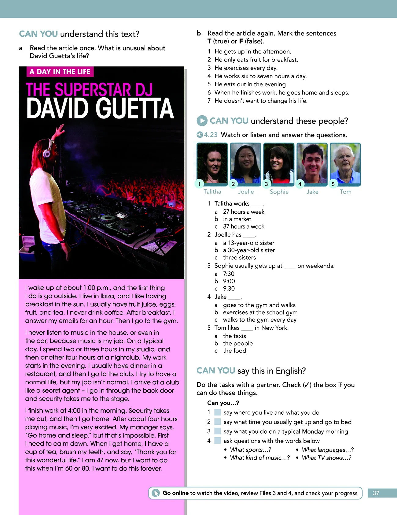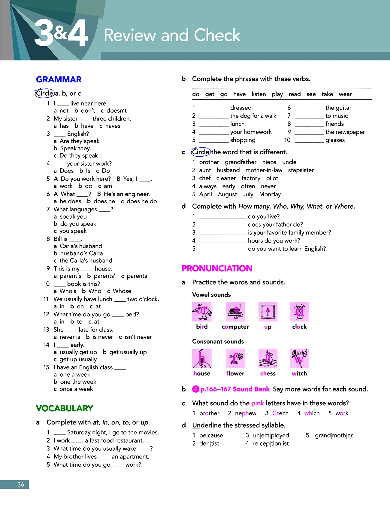 هر درس سه بخش با تایتل های vocabulary، grammar، pronunciation دارد که این نشان از توجه بیشتر کتاب American English File 1 ویرایش سوم بر روی تقویت مهارت گفتاری از طریق آموزش تلفظ، لغات و گرامر است که در خلال اینها مهارت های لیسنینگ و رایتینگ و ریدینگ نیز جای داده شده است.