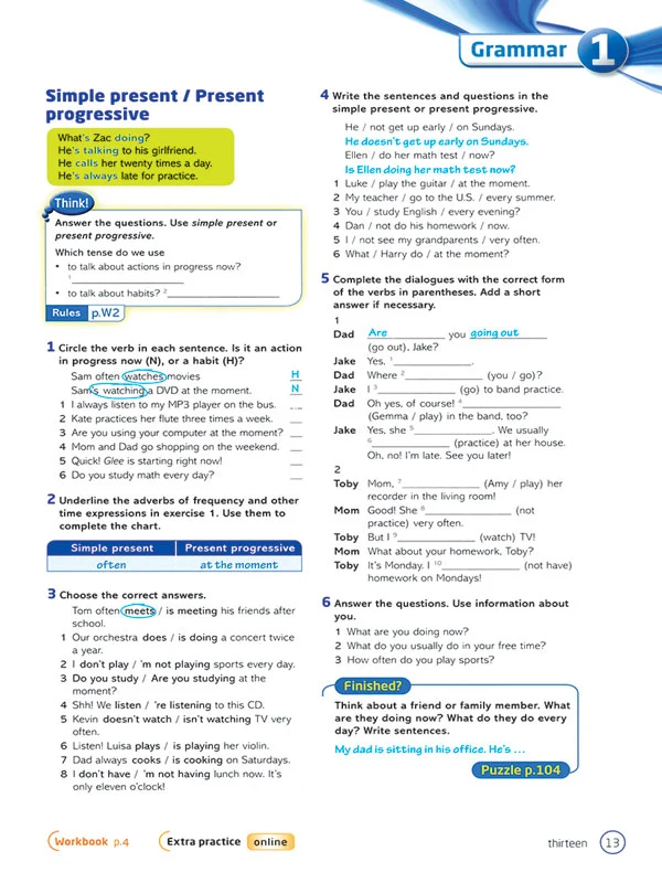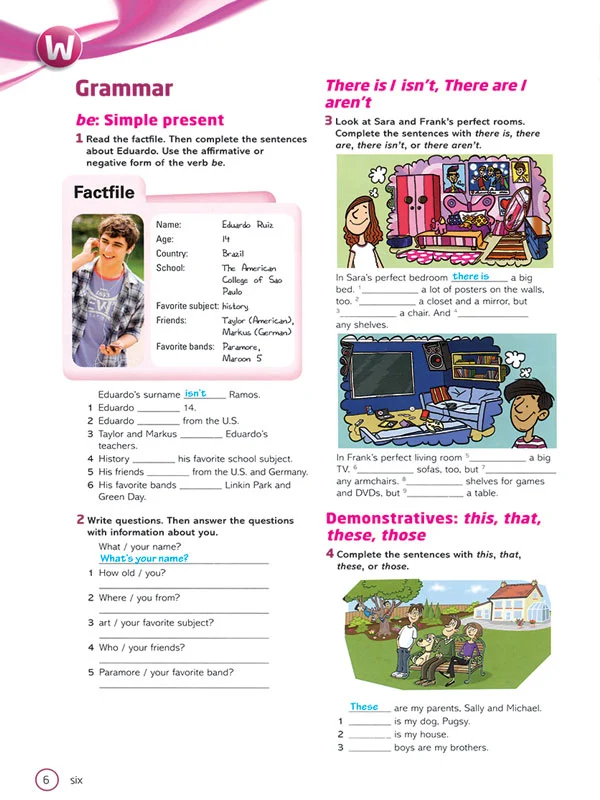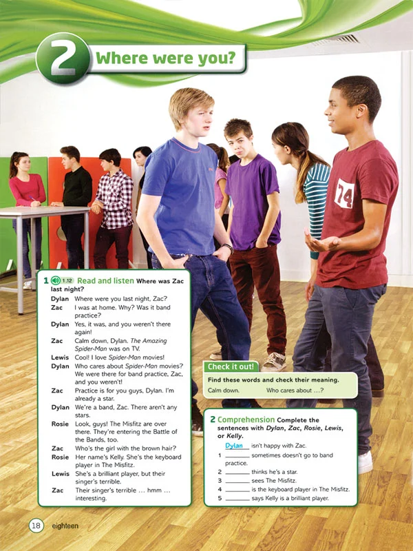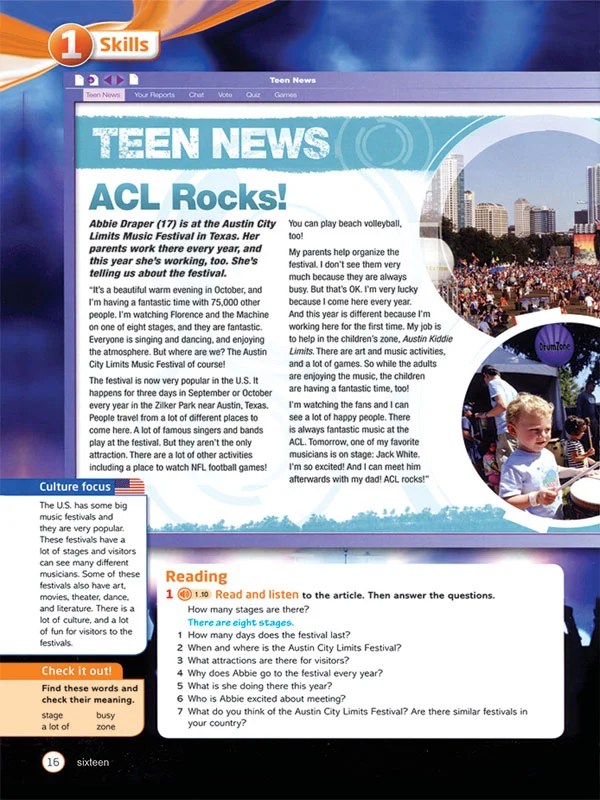 vocabulary: در این بخش با توجه به اینکه کتاب دارای 8 فصل است: musical genres and instruments؛ physical descriptions؛ the weather؛ movies؛ food and drink؛ transportation؛ geography؛ feelings and emotions
