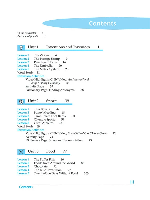 ساختاری مناسب: کتاب موردنظر دارای۷ unit مختلف است که هر کدام دارای ۵ درس می باشند، لازم به ذکر است که پس از اتمام این ۷ بخش، سه قسمت دیگر به نام های Vocabulary، Skills Index و Irregular Verbs برای تکمیل دانش زبان آموزان آورده شده است.